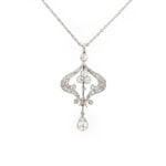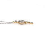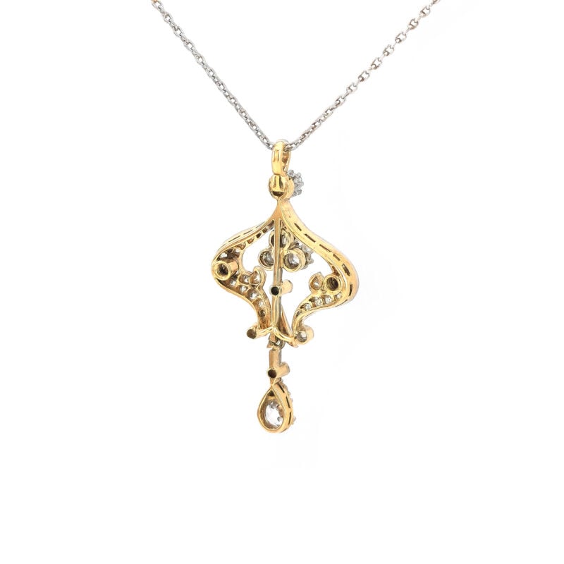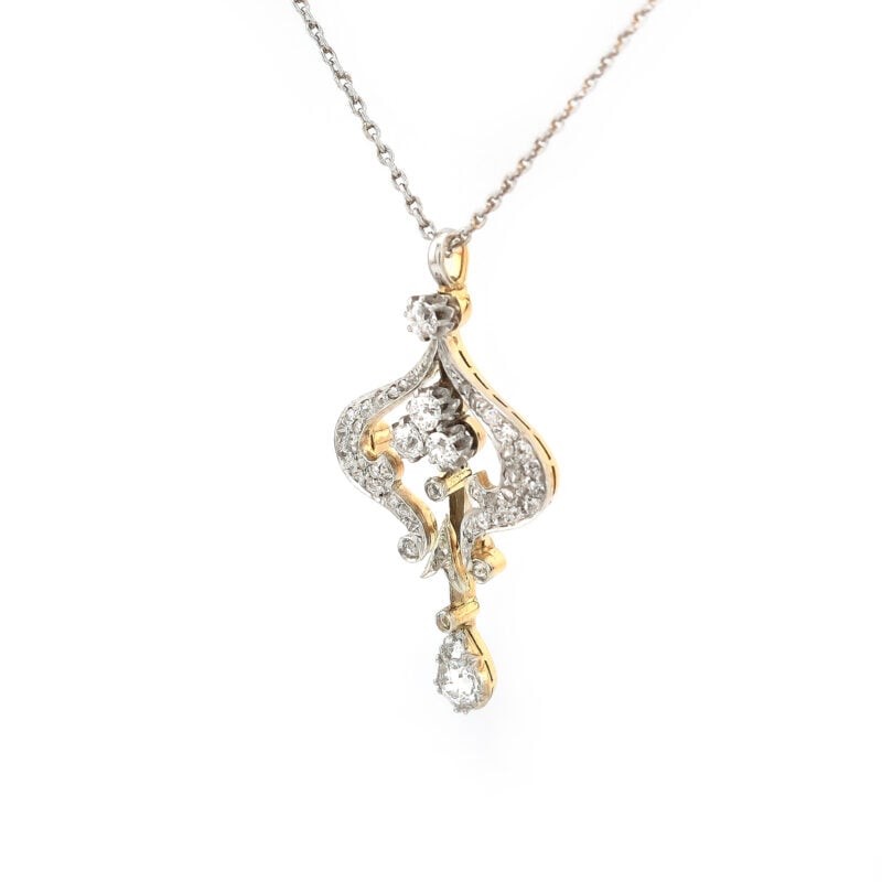 Das hier vorliegende Collier um 1900 glänzt mit einem Besatz aus insgesamt 47 Diamanten von zusammen etwa 1,2 ct. Die Edelsteine im historischen Altschliff sind in Silber gefasst, was den warmen Glanz der Steine ergänzt. Die Rückseite des Anhängers besteht hingegen aus 585er Gold.