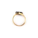 Schwungvoller sog. Toi-et-moi-Ring im Jugendstil aus 585er Rosegold mit einem Rosenschliff Diamanten mittig in Weissgold Zarge und jeweils einem Saphire an den Seiten in Krappe gefasst.