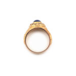 Massiver Militärring aus Rosegold. Das Herzstück bildet ein ovaler Sternsaphir – ein seltener Edelstein, der bei Lichteinfall einen einzigartigen, schimmernden Sterneneffekt, die sogenannte Asterismus, zeigt. Beschriftung der Fassung: “United State Marines”