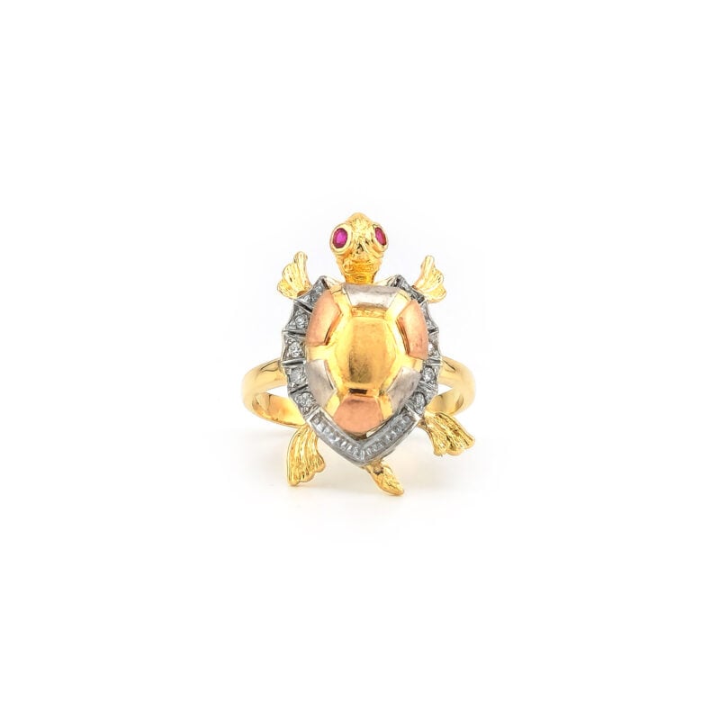 Dieser kunstvolle Ring in Schildkröten-Form besticht durch sein Tricolor-Design. Gefertigt aus 585er Gold, kombinieren sich Gelb-, Weiß- und Roségold zu einem detailreichen Panzer. Der Rand ist mit funkelnden Diamanten besetzt, während zwei leuchtend rote Rubine als Augen Akzente setzen.