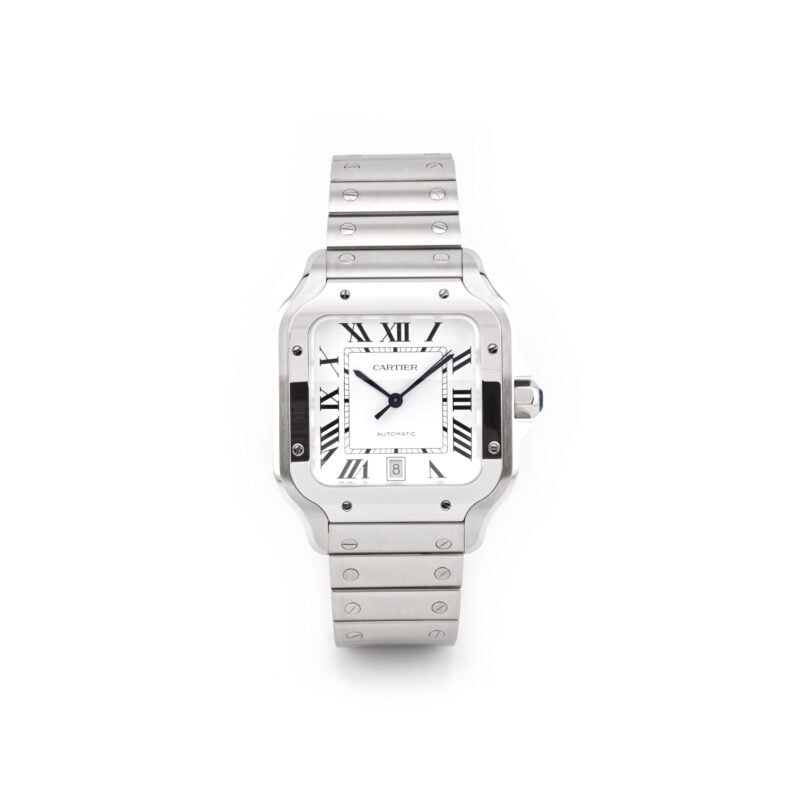 Santos, großes Modell, Uhrwerk mit Automatikaufzug, Kaliber 1847 MC. Gehäuse aus Edelstahl 47,5 x 39,8 mm, Mehrkantaufzugskrone mit einem facettierten synthetischen Spinell besetzt, silberfarbenes Opalin-Zifferblatt. Zweites Armband aus Kalbsleder mit austauschbarer Doppeltfaltschließe aus Stahl.